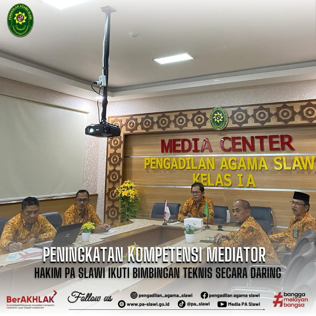 MEDIASI ELEKTRONIK DI PA SLAWI Jum’at, 12 September 2025, Pengadilan Agama Slawi melaksanakan mediasi secara elektronik di Ruang Mediasi untuk perkara Cerai Talak dengan nomor 2812/Pdt.G/2025/PA.Slw. Sebagai Hakim Mediator, bapak Misman Hadi Prayitno, S.Ag., M.H. memimpin mediasi secara daring melalui Zoom Meeting, dengan salah satu pihak berada di lokasi berbeda. Pelaksanaan mediasi elektronik ini mempermudah […]